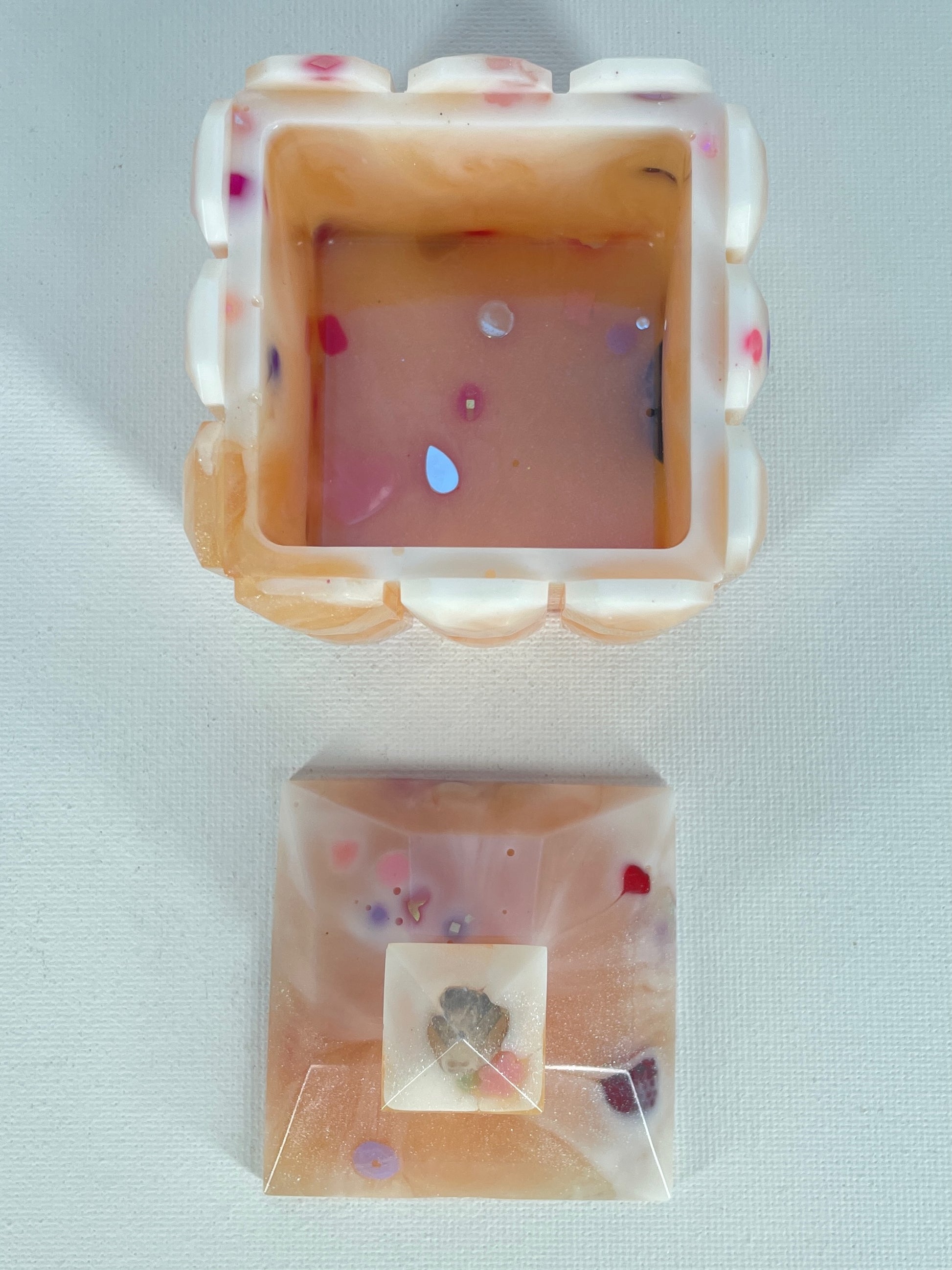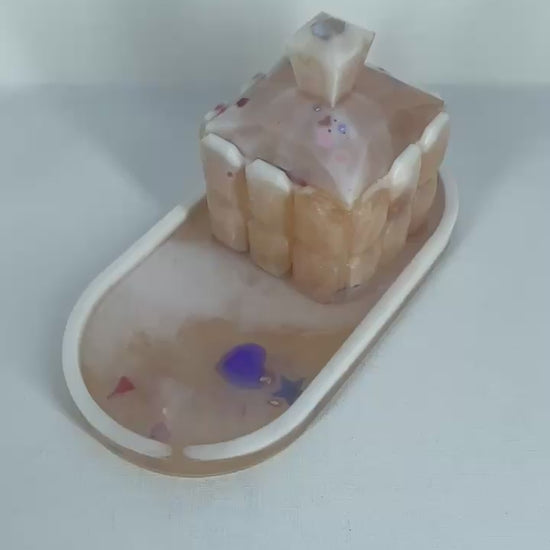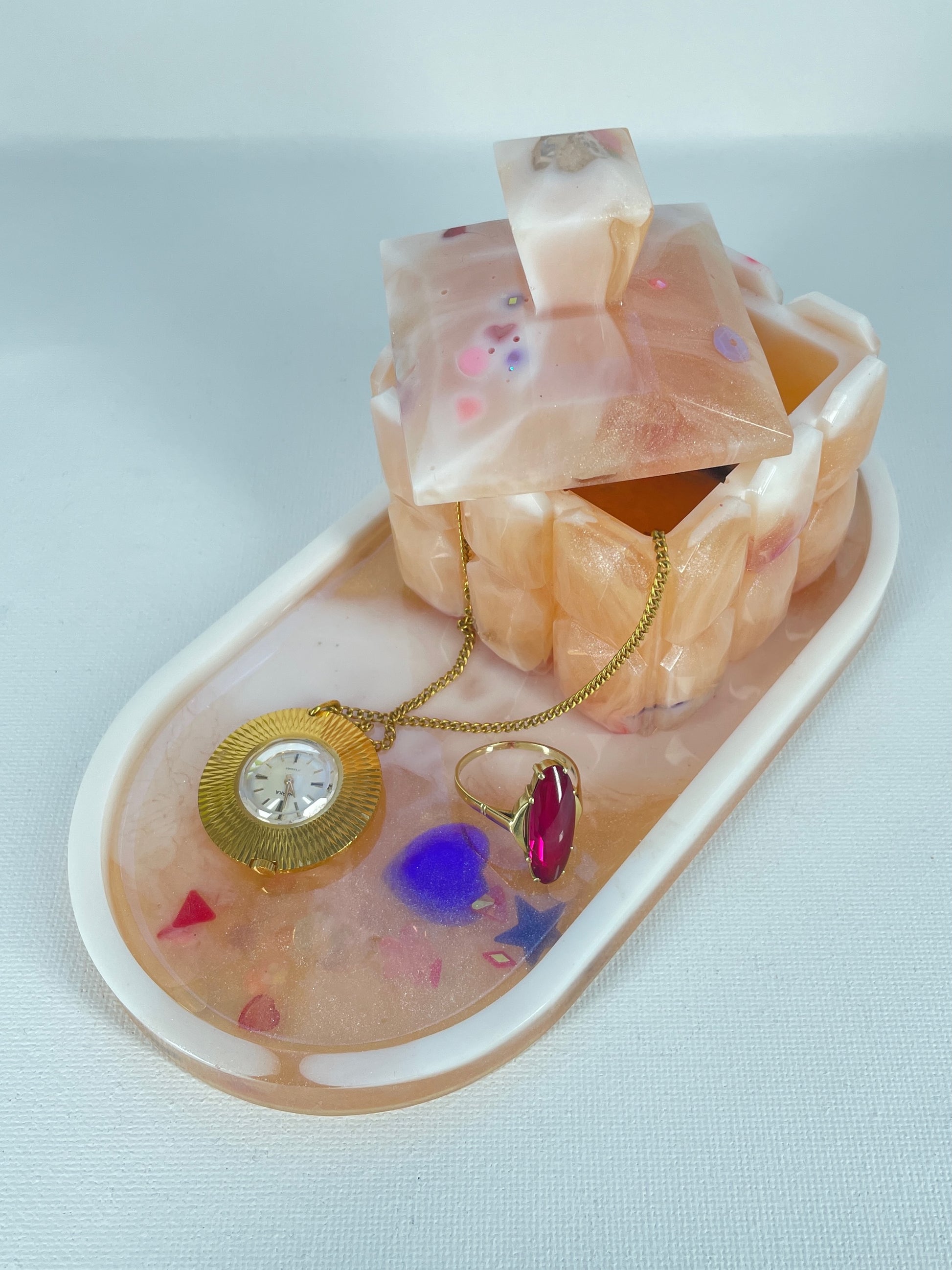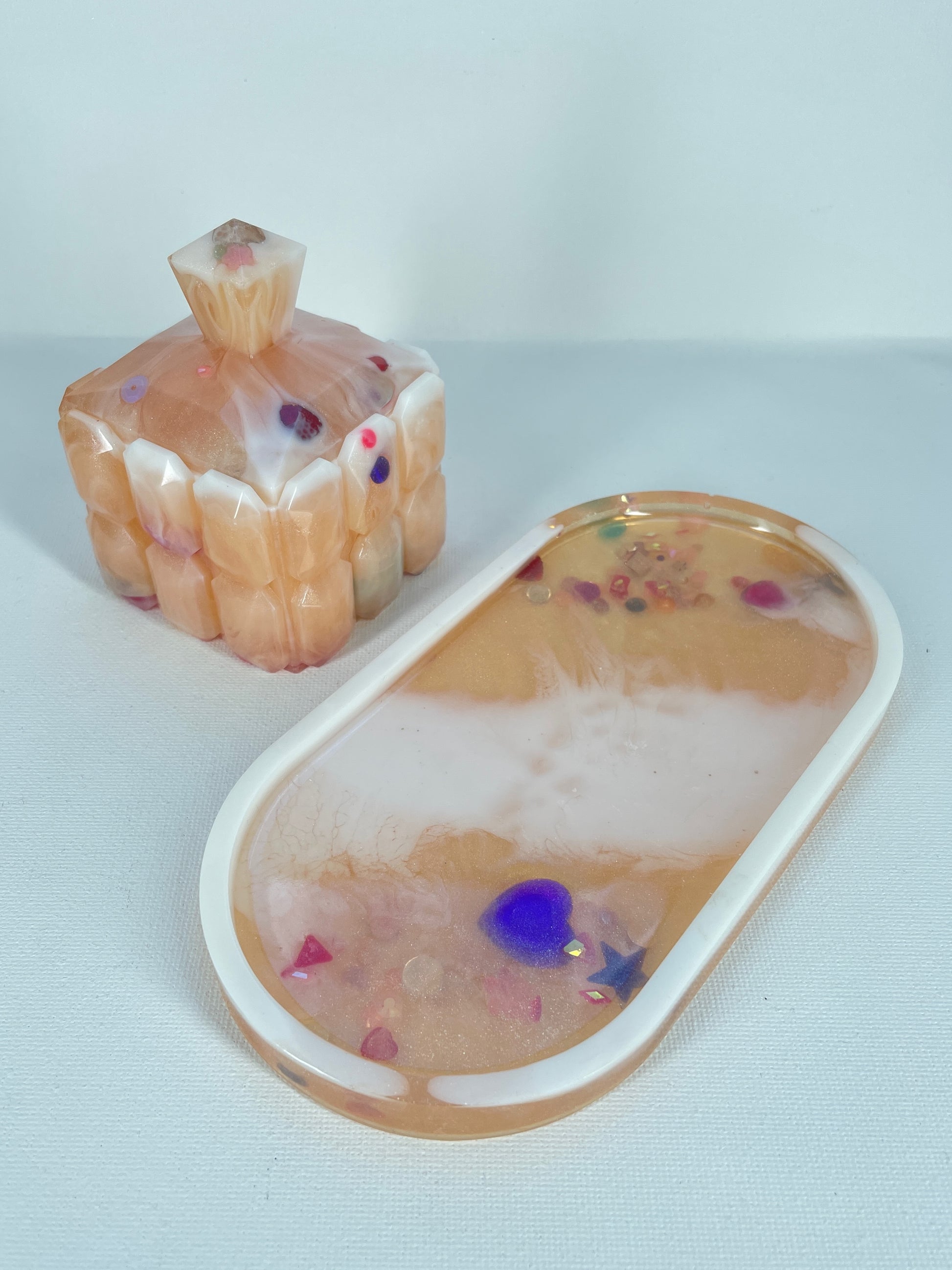 Diese exklusive Badezimmer Set aus hochwertigem, deutschem Epoxidharz ist ein handgefertigtes Einzelstück, die durch ihre einzigartige Farbgebung und glänzende Oberfläche besticht. Jedes Exemplar wird mit großer Sorgfalt und Liebe zum Detail gegossen und verbindet praktische Ordnung mit elegantem Design für Ihr Zuhause.