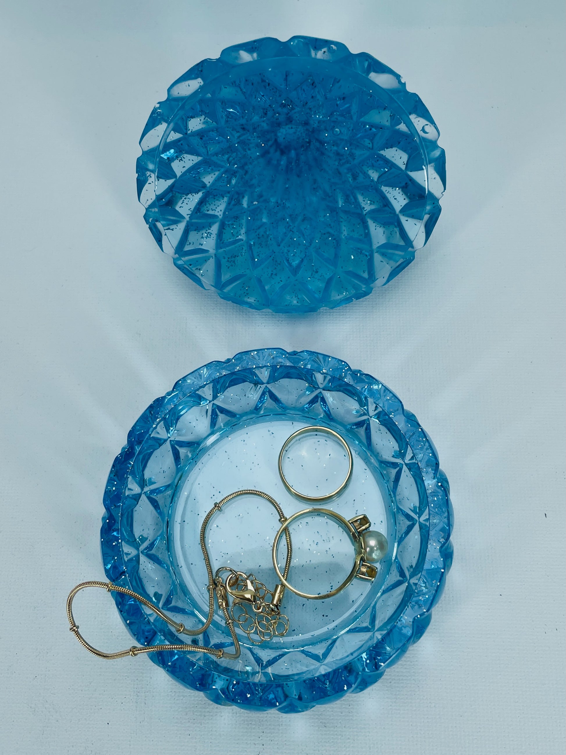 Diese exklusive Schmuckdose aus hochwertigem, deutschem Epoxidharz ist ein handgefertigtes Einzelstück, die durch ihre einzigartige Farbgebung und glänzende Oberfläche besticht. Vielseitig einsetzbar im Bad, Schlafzimmer, Flur oder Büro, bieten sie stilvolle Aufbewahrung für Hygieneartikel, Schmuck, Haargummis und mehr. Jedes Exemplar wird mit großer Sorgfalt und Liebe zum Detail gegossen und verbindet praktische Ordnung mit elegantem Design für Ihr Zuhause.