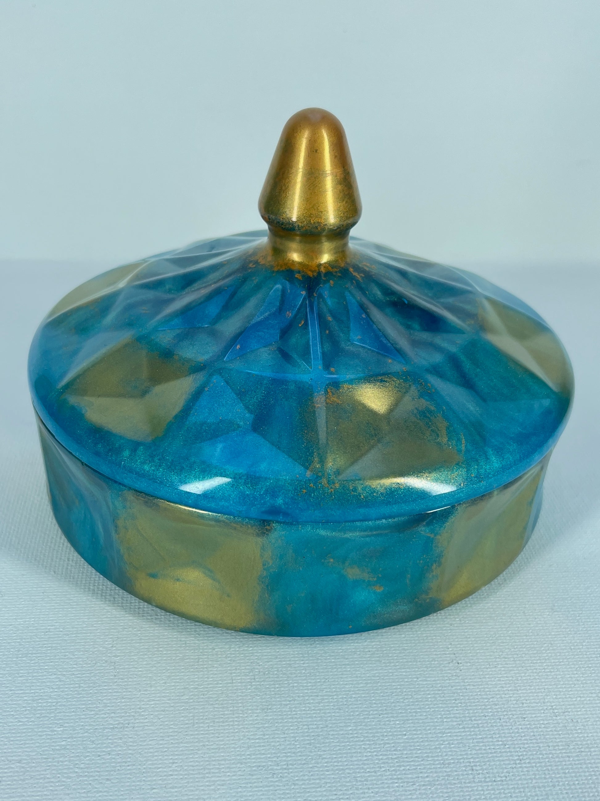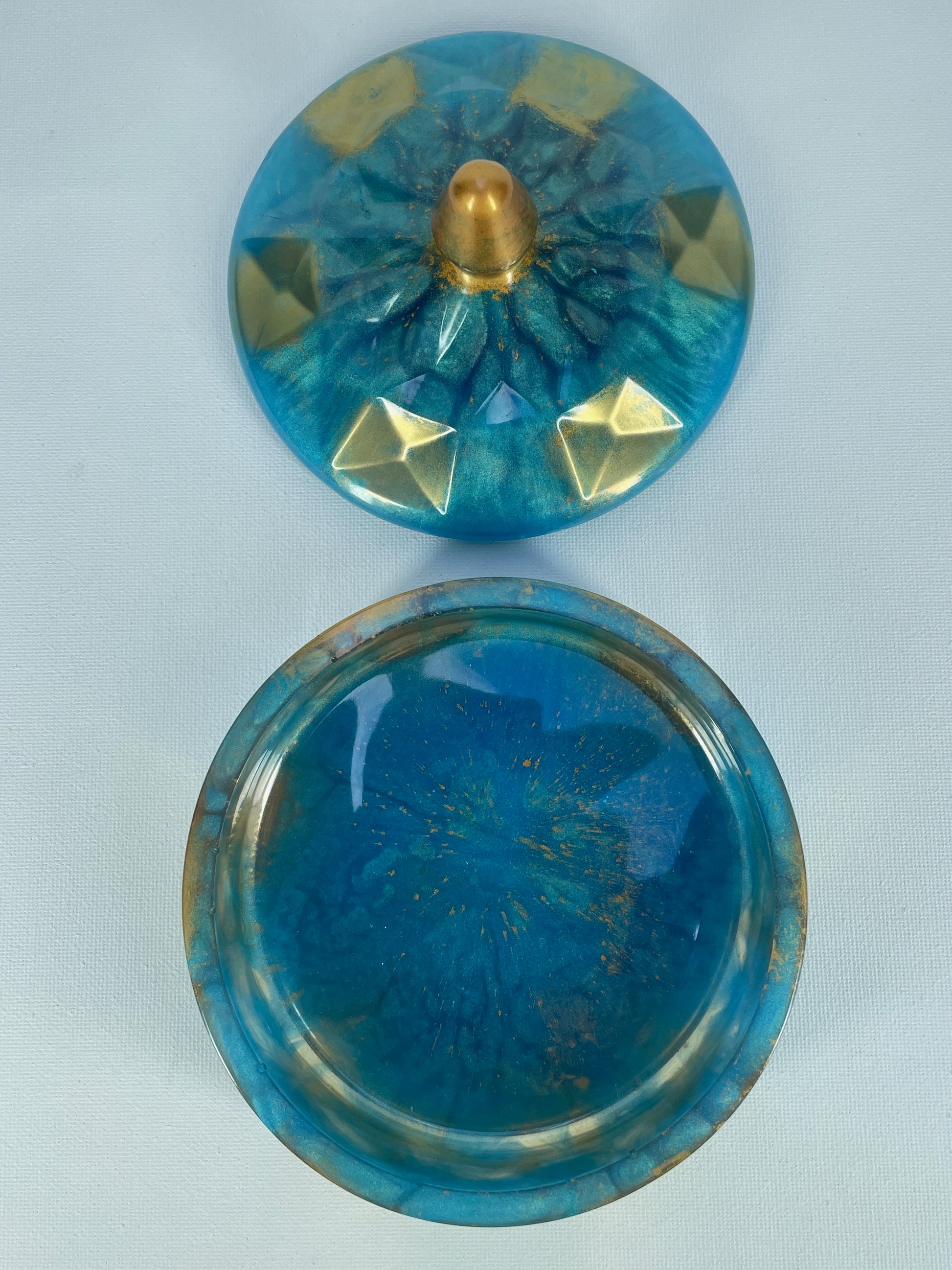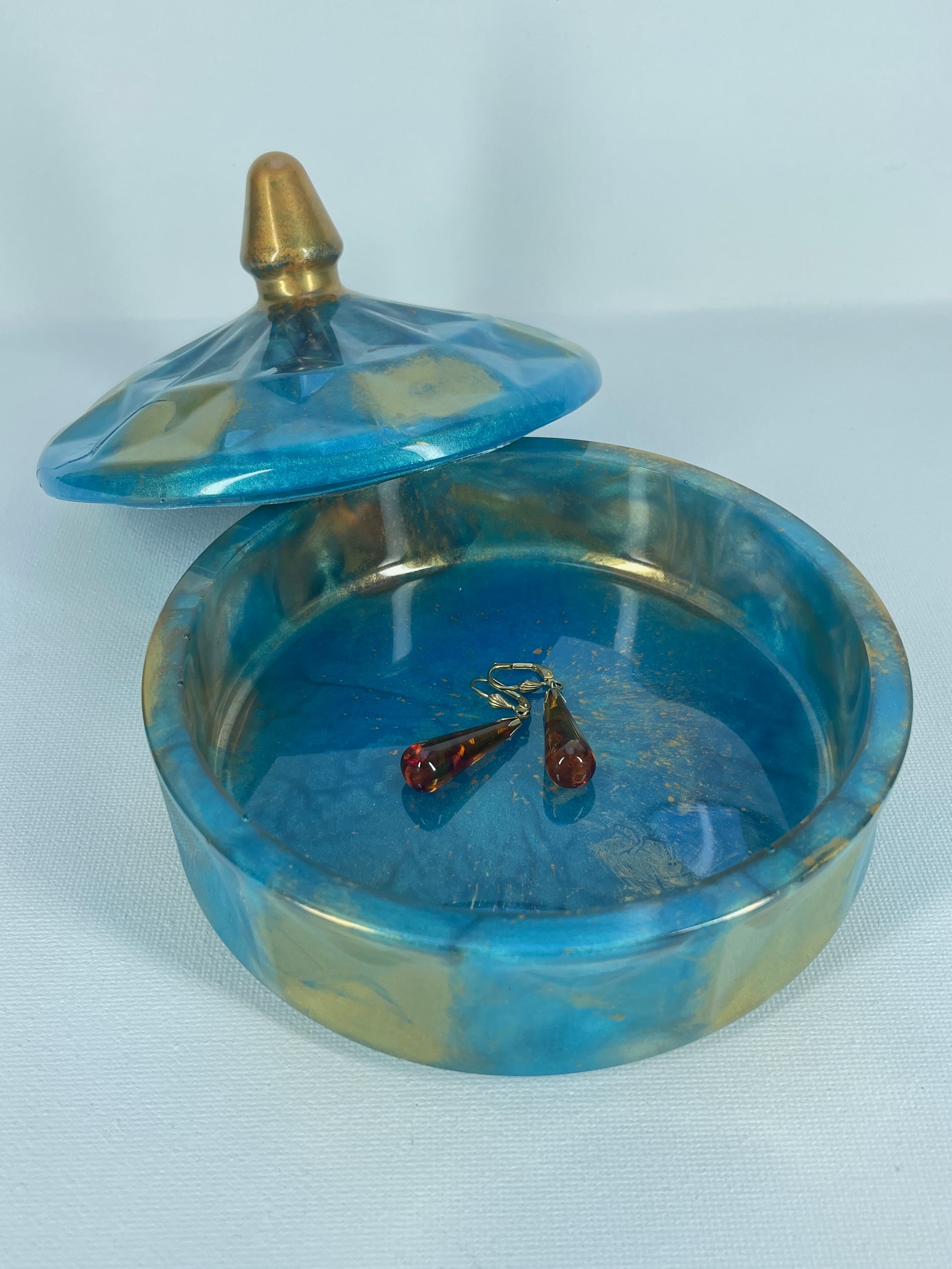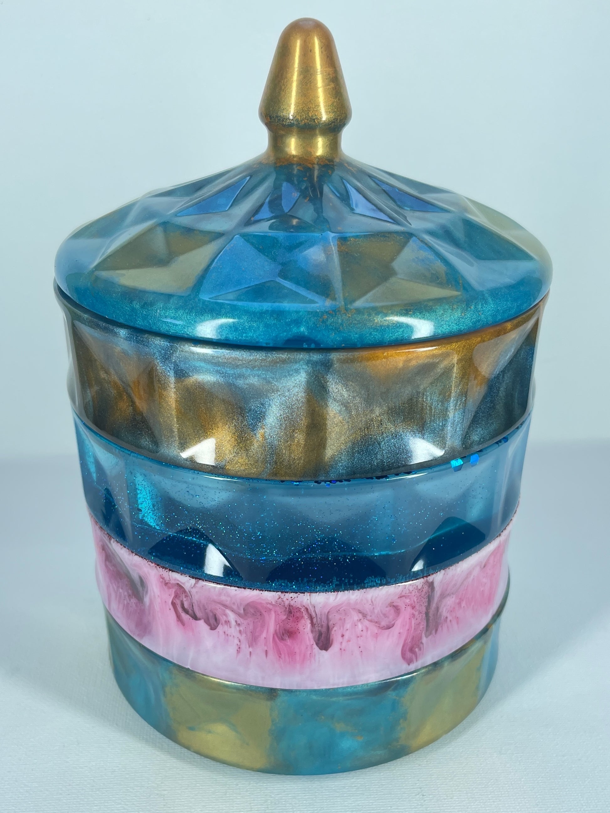 Diese exklusive Schmuckdose aus hochwertigem, deutschem Epoxidharz ist ein handgefertigtes Einzelstück, die durch ihre einzigartige Farbgebung und glänzende Oberfläche besticht. Vielseitig einsetzbar im Bad, Schlafzimmer, Flur oder Büro, bieten sie stilvolle Aufbewahrung für Teelichter, Hygieneartikel, Schmuck, Haargummis und mehr. Jedes Exemplar wird mit großer Sorgfalt und Liebe zum Detail gegossen und verbindet praktische Ordnung mit elegantem Design für Ihr Zuhause. Unterdosen sind stapelbar!