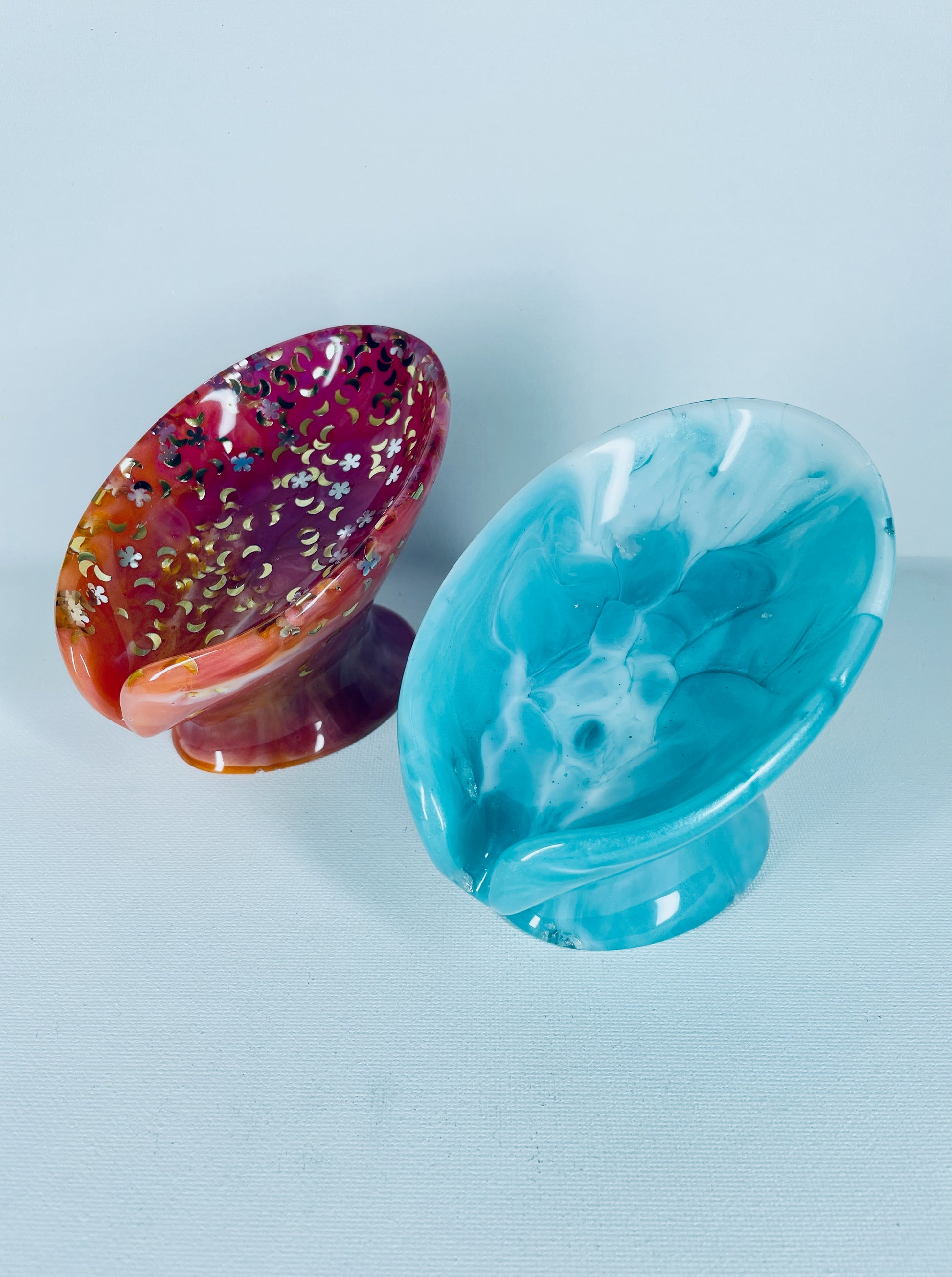 Diese exklusive Seifenschale aus hochwertigem, deutschem Epoxidharz ist ein handgefertigtes Einzelstück, die durch ihre einzigartige Farbgebung und glänzende Oberfläche besticht. Jedes Exemplar wird mit großer Sorgfalt und Liebe zum Detail gegossen und verbindet praktische Ordnung mit elegantem Design für Ihr Zuhause. Lieferung ohne Seife!