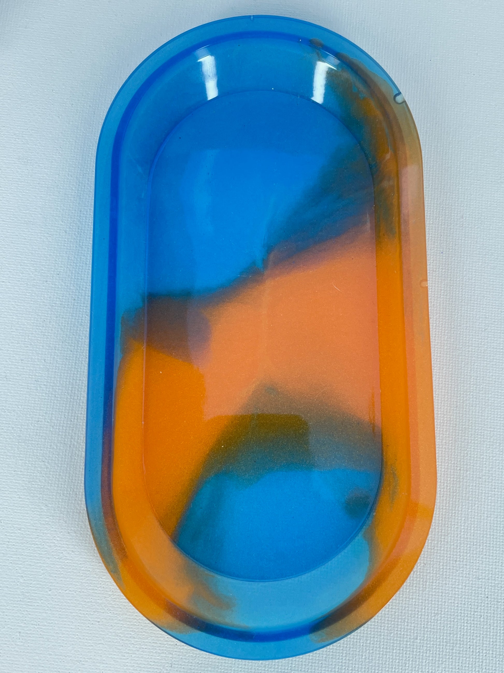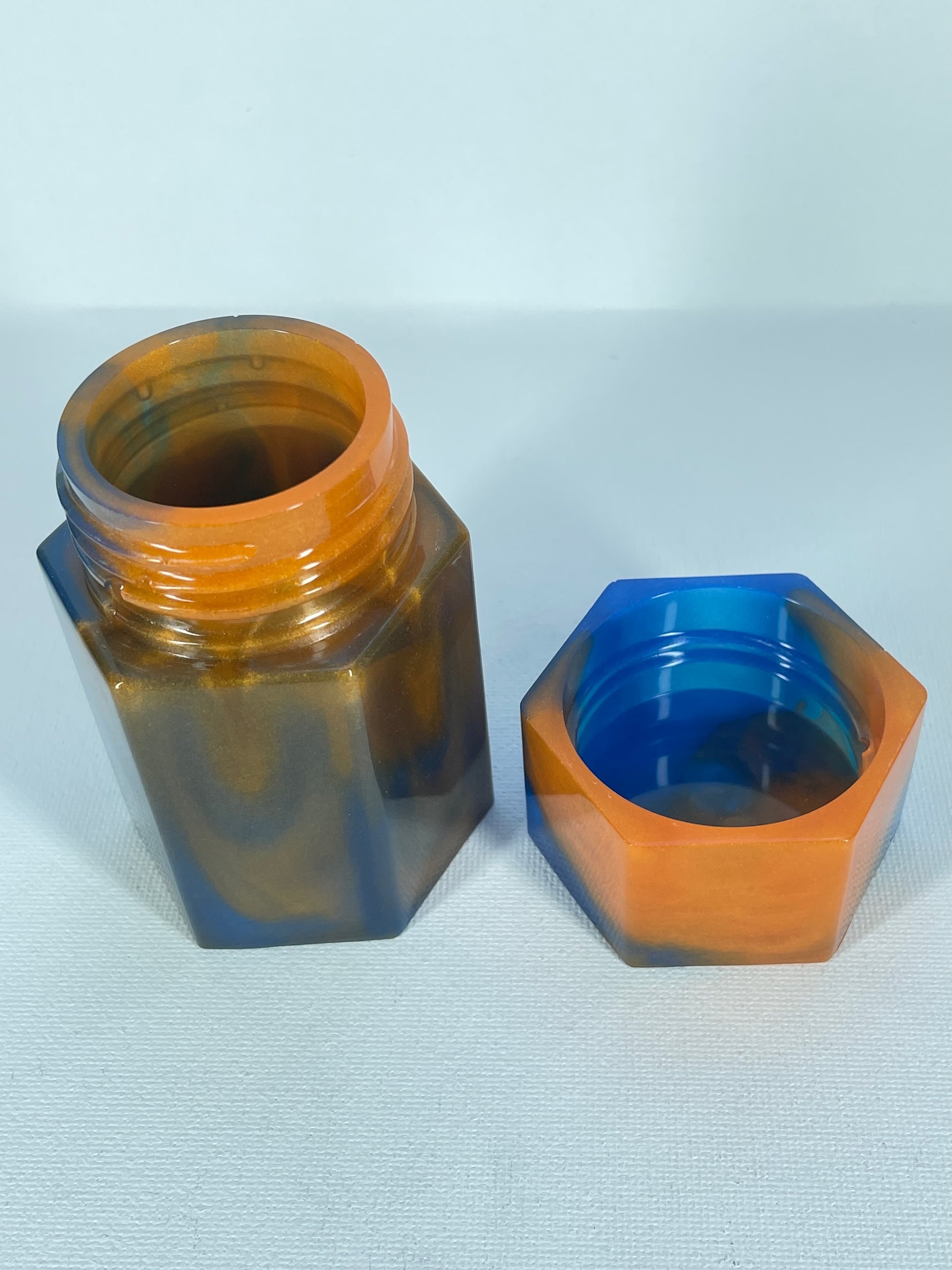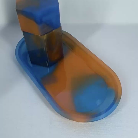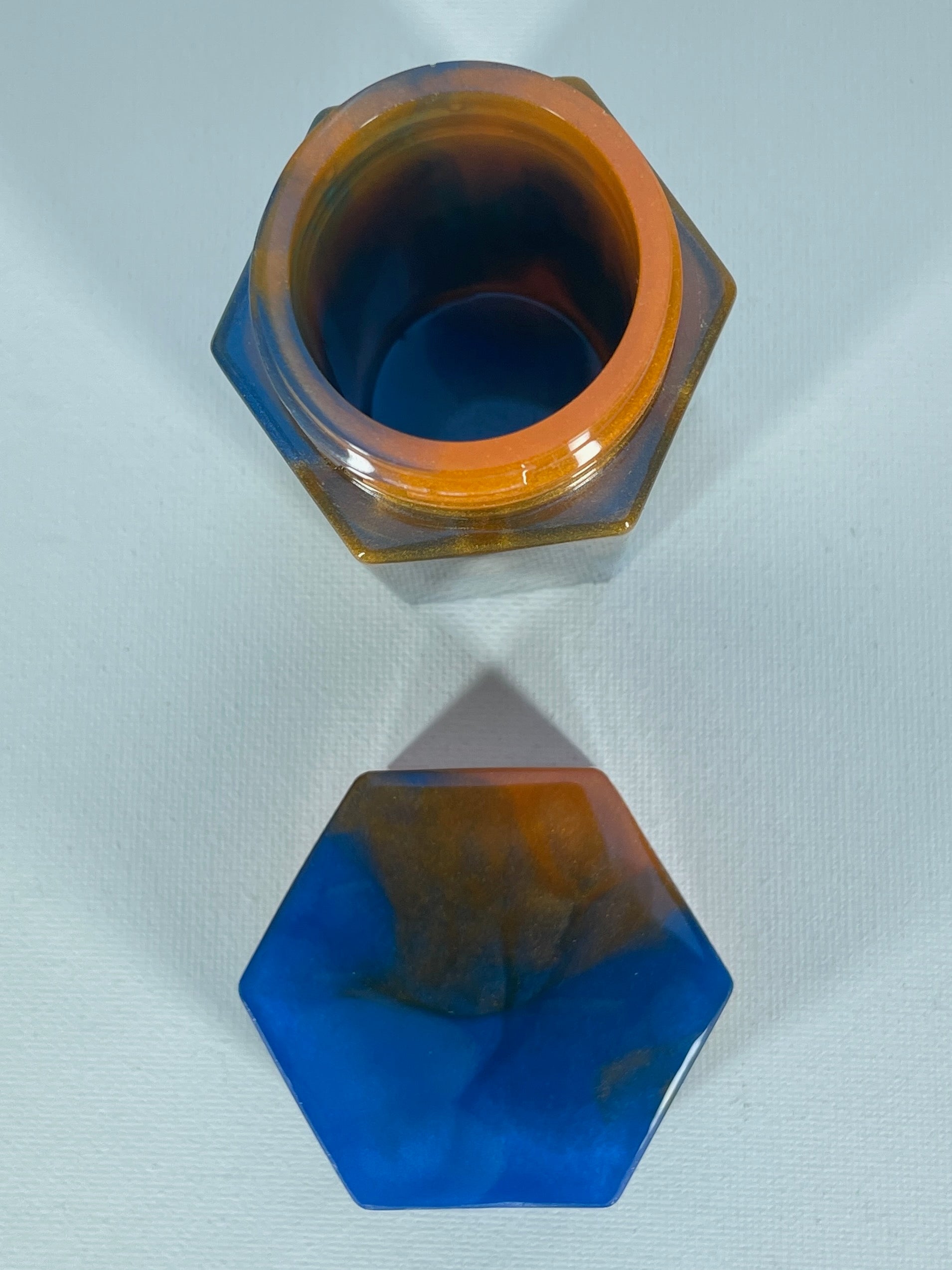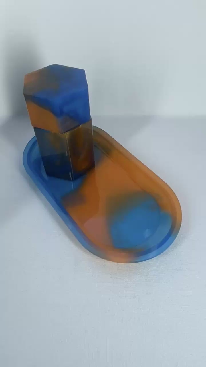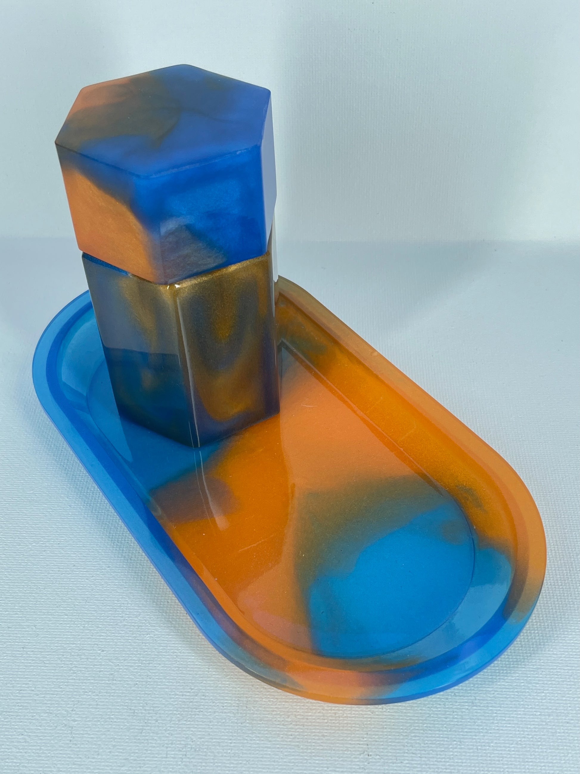 Diese exklusive Set (Tablett und Schraubdose) aus hochwertigem, deutschem Epoxidharz ist ein handgefertigtes Einzelstück, die durch ihre einzigartige Farbgebung und glänzende Oberfläche besticht. Jedes Exemplar wird mit großer Sorgfalt und Liebe zum Detail gegossen und verbindet praktische Ordnung mit elegantem Design für Ihr Zuhause.